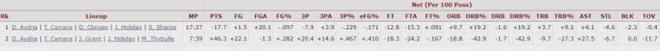 而由克林根、阿夫迪亚、卡马拉、霍乐迪、夏普组成的首发主力五人组总计组合出场17分27秒,在开拓者队内排名第1,这套阵容的进攻效率是每百回合-17.7,篮板保护做的不错,每百回合篮板效率+3.7.