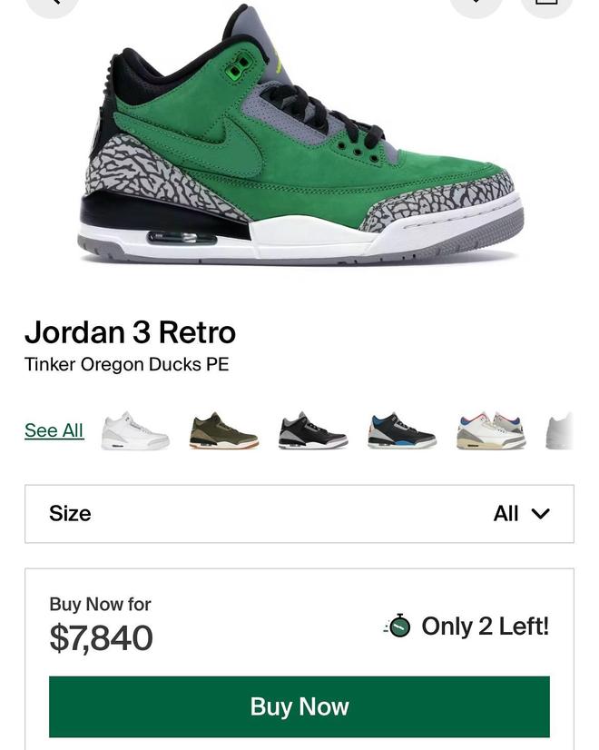 据美媒报道,库里上脚的这双AJ3俄勒冈大学PE,传闻货量仅500-1000双,所以流出后迅速成为二级市场焦点,目前价格在8000美元左右。