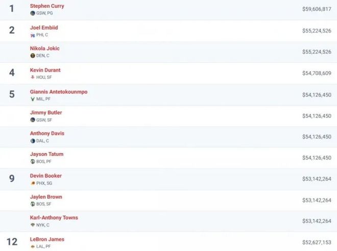 今日美媒HoopsHype发文统计了NBA球员的税后工资(指球员在扣除联邦税、州税、地方税和运动员税后的实际收入),具体如下(由高到低):