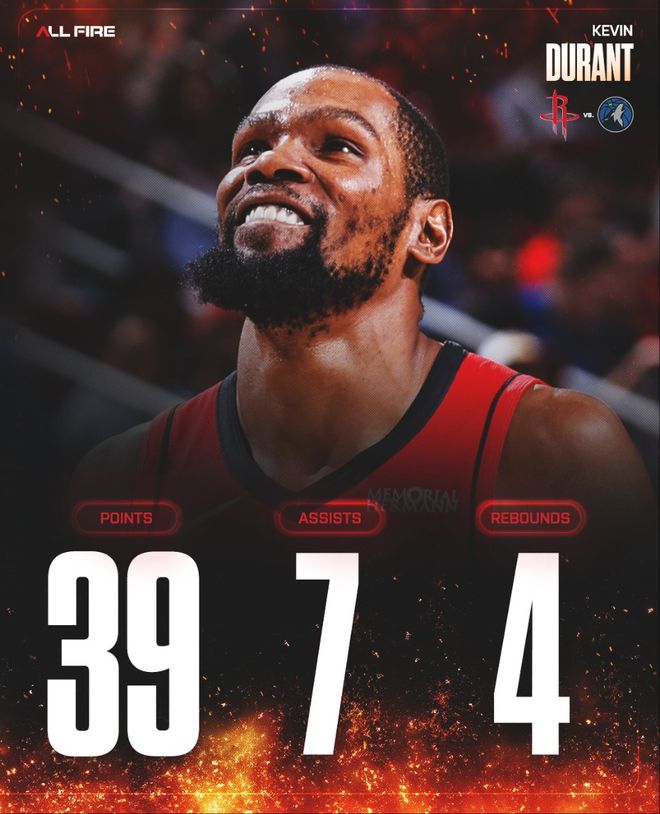全场比赛杜兰特鏖战40分钟(火箭全队最高),18中11,三分8中6,罚球14中11,拿到39分7助攻4篮板2抢断1盖帽,命中率61.1%,三分命中率75%,真实命中率80.7%,正负值+15。