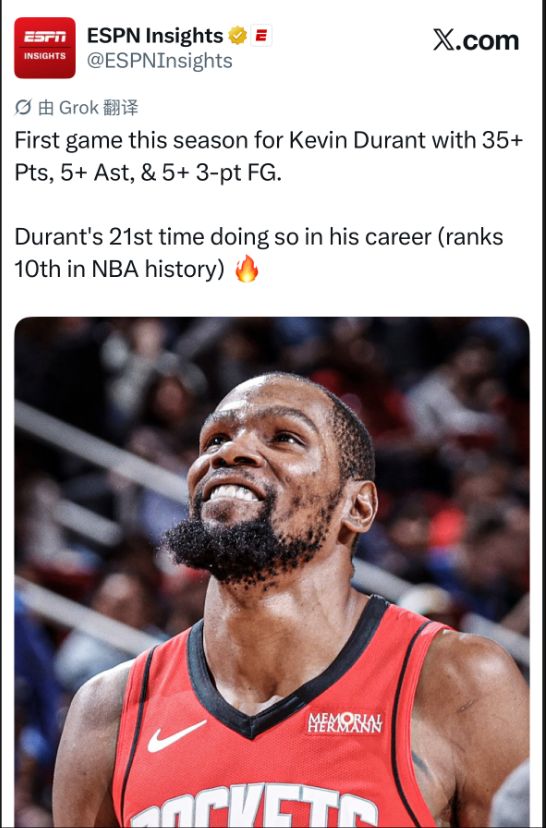 3.这是杜兰特火箭生涯首次35+5+5三分的场次;