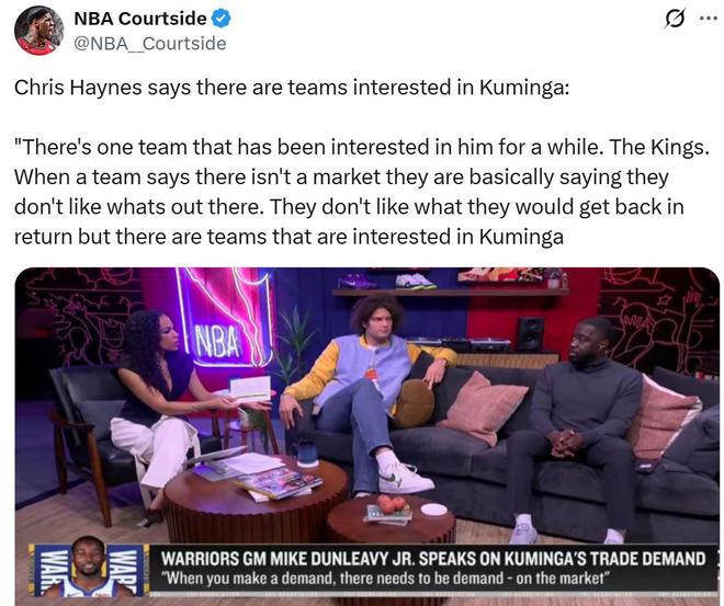 同时库明加的未来依旧悬而未决,名记Chris Haynes表示国王队依旧是市场中唯一有意库明加的球队,但他们提供的筹码勇士不感兴趣。