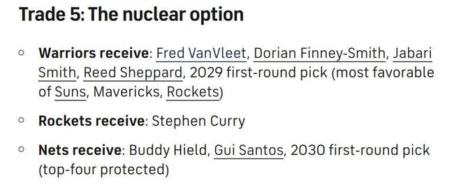 为此,美媒《cbssports》送给勇士队5笔有望扭转局面的大胆交易方案,其中4笔是帮助库里留在勇士争冠,另外一笔则是将库里送往具备争冠能力的火箭队。