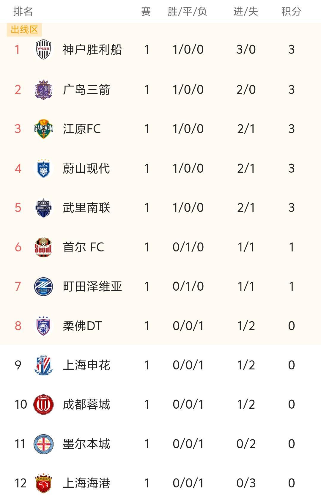 亚冠精英东亚区第二轮结束了所有比赛,最新积分榜如下!