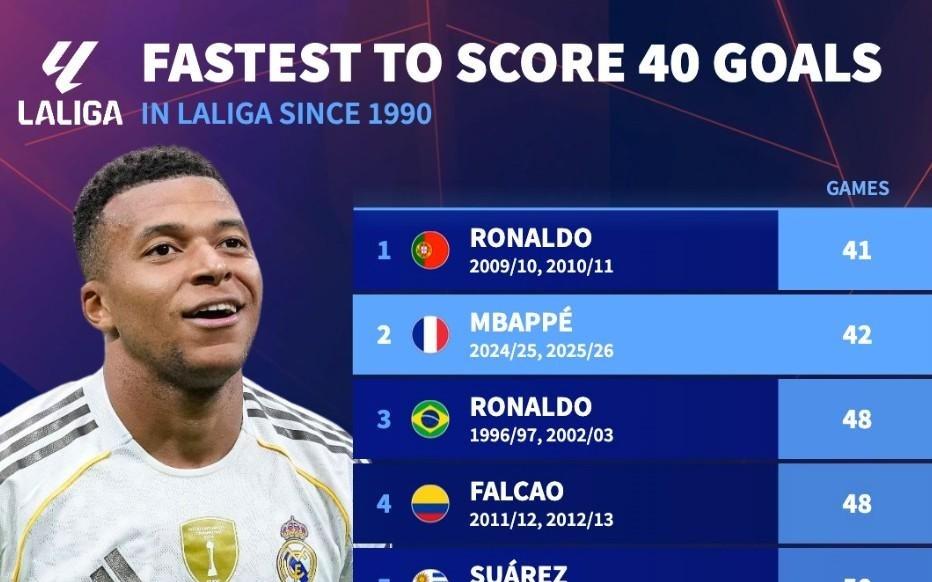 42场,姆巴佩是90年以来仅次于C罗第二快达成西甲40球的球员