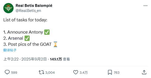 贝蒂斯官方调侃阿森纳:今日任务第一官宣安东尼,第二阿森纳