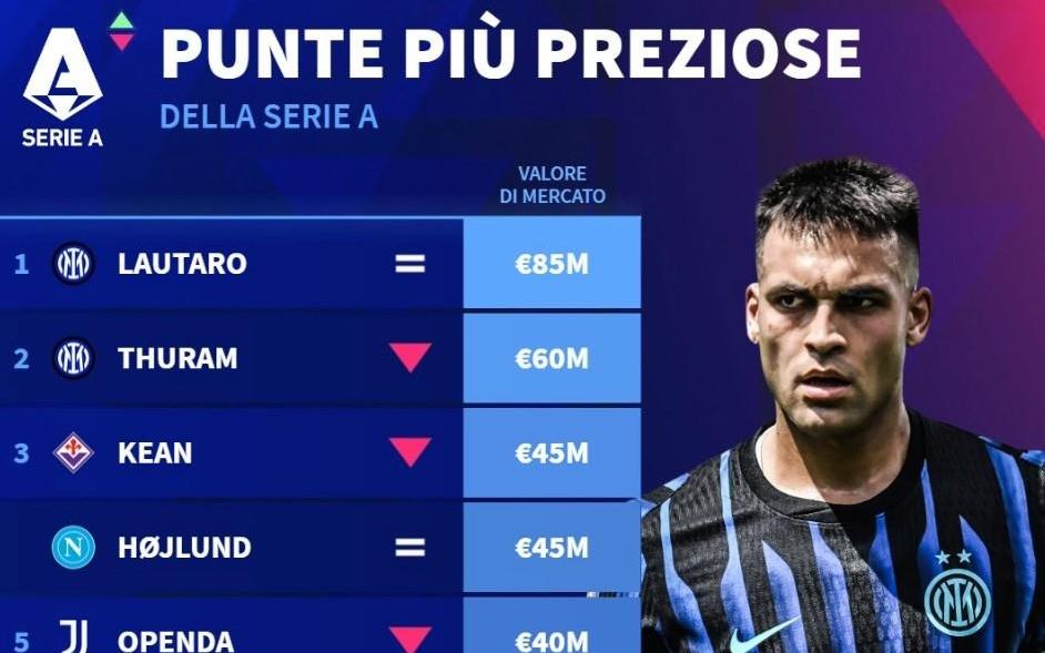 德转列意甲中锋身价前10:劳塔罗8500万第1,霍伊伦4500万第3