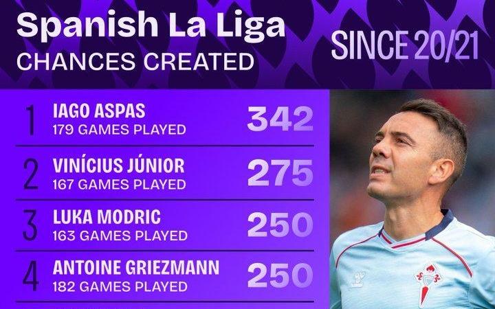 西甲2021赛季后创造机会榜:阿斯帕斯居首,维尼修斯第二