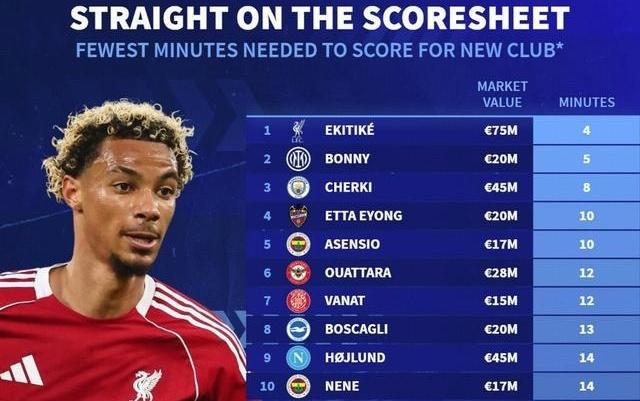 德转统计夏窗新援最快攻入首球排名:埃基蒂克居首