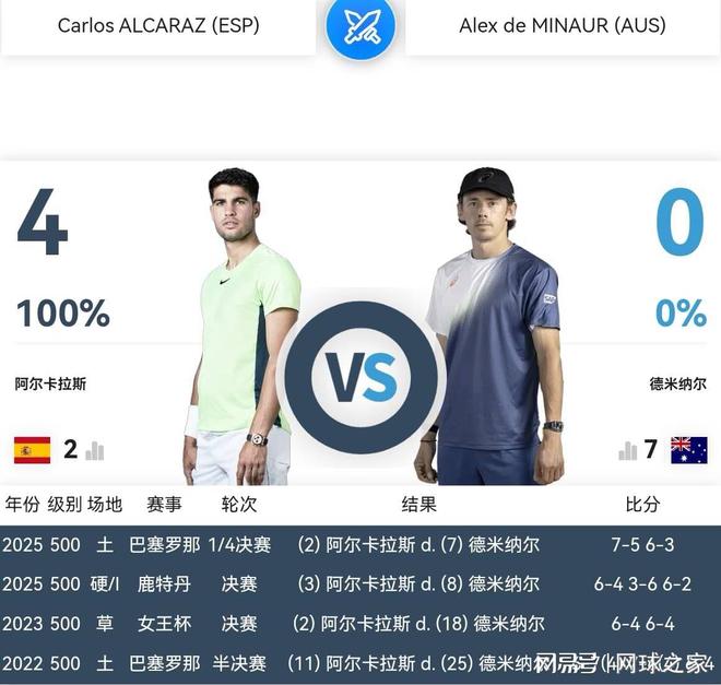 本赛季两人交锋两次。ATP500鹿特丹站决赛,阿尔卡拉斯2:1获胜,夺取职业生涯第一个室内硬地冠军。ATP500巴塞罗那站1/4决赛,阿尔卡拉斯两盘横扫对手,将两人交锋战绩改写为四胜零负。如今来到年终总决赛小组赛,已经是第三次参赛的阿尔卡拉斯,面对第二次参赛的德-米纳尔,应该能够手起拍落,不给对手什么机会。