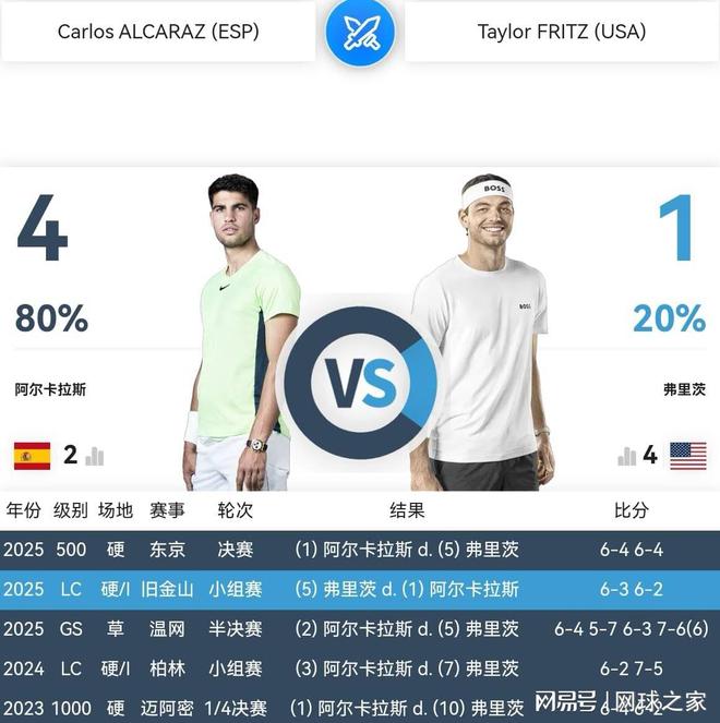 弗里茨硬地作战能力,当比草地、红土更胜一筹。两人职业生涯至今交锋五次,弗里茨一胜四负,阿尔卡拉斯大幅领先。