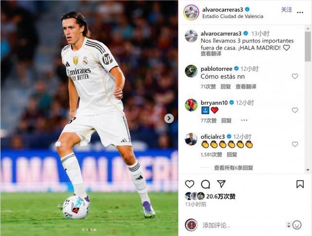 卡雷拉斯社媒晒出比赛照片,庆祝球队取胜,他写道:“我们在客场拿下重要的3分!Hala Madrid!”