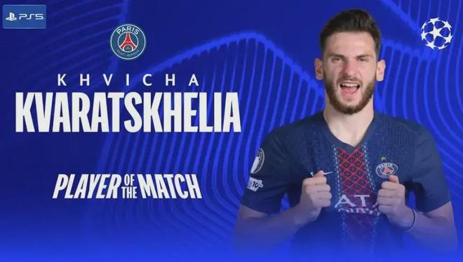 巴黎圣日耳曼主场4-0大胜亚特兰大,赛后,欧冠联赛官方宣布,巴黎圣日耳曼球员克瓦拉茨赫利亚当选全场比赛最佳球员。
