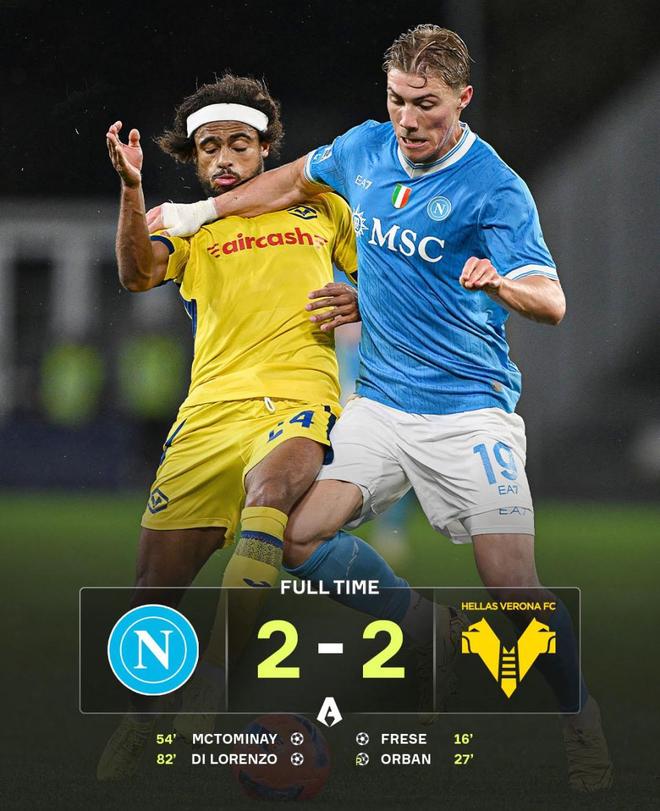 第82分钟,队长迪洛伦佐迎球推射得手,那不勒斯连扳两城,将比分定格在2-2。