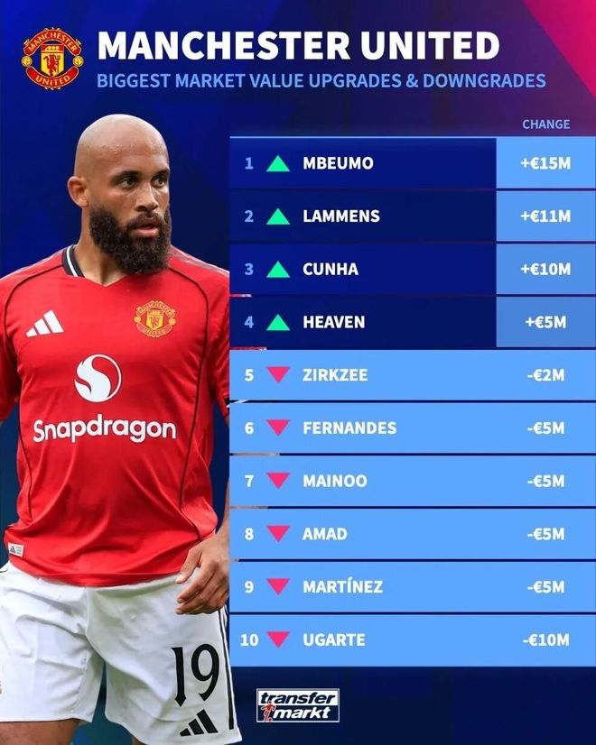 齐尔克泽,费尔南德斯,梅努,阿马德,马丁内斯和乌加特的身价则上了下跌榜。