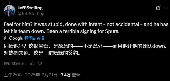 然而,前天空体育主持人、现任talkSPORT主持人的斯特林并不打算为这位22岁的球员说话。一位球迷表示为西蒙斯感到难过,斯特林在X上回应道:“为他感到难过?那动作很愚蠢,是故意的,绝非意外,他让球队失望了。对热刺来说,这是一笔糟糕的签约。”